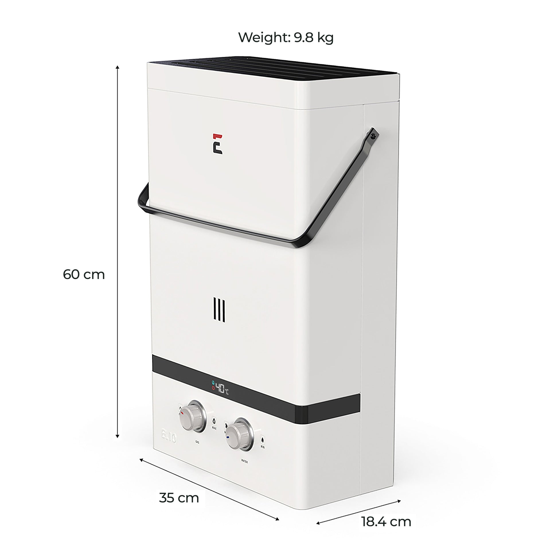 Not only is the EL10-E CE-certified, but it is also designed for safety and convenience. Safety features include a built-in anti-flame tilt switch that shuts the water heater off when tilted past 45 degrees, as well as multiple sensors that regulate temperature and prevent scalding.